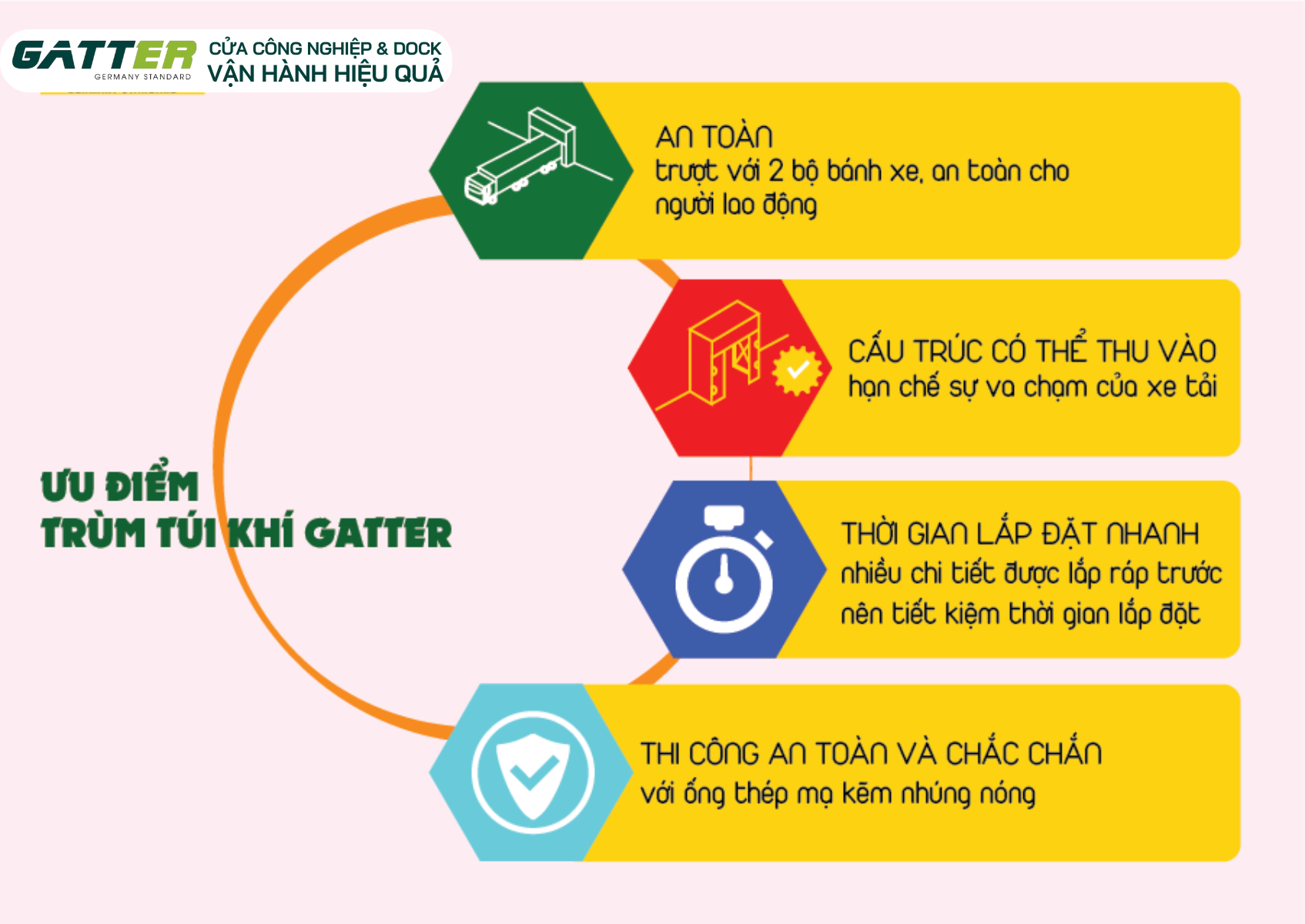 Bộ trùm túi khí với kết cấu bao che có khả năng tự co giãn, kết cấu này giúp trùm kín thân xe và kết nối với cửa xuất kho nhằm chống thất thoát hơi lạnh đảm bảo nhiệt kho, đồng thời ngăn bụi bẩn, nước mưa, chống côn trùng xâm nhập vào bên trong kho, rất thích hợp để sử dụng trong những môi trường có nhiệt độ thấp.